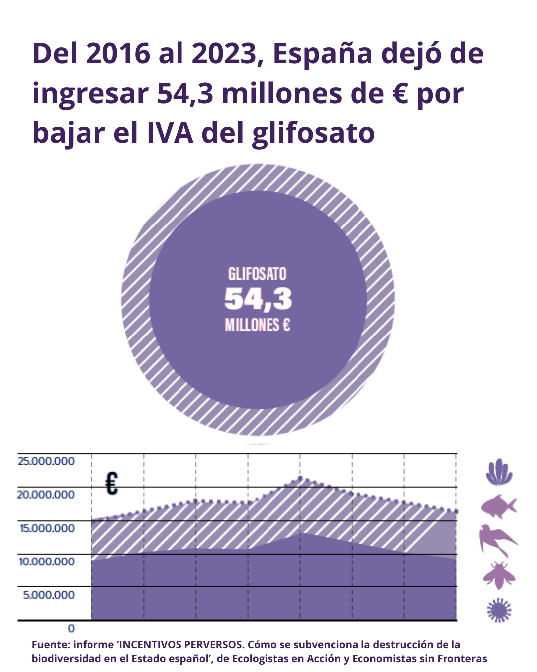 Por ejemplo, la rebaja del IVA al herbicida glifosato, un herbicida tóxico empleado en tal cantidad que contamina el 34,6% de las aguas superficiales españolas, supuso que España dejara de ingresar 54,3 millones de € entre los años 2013 y 2022.